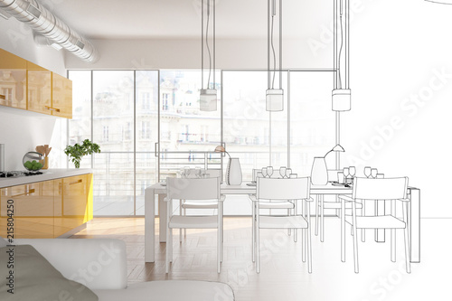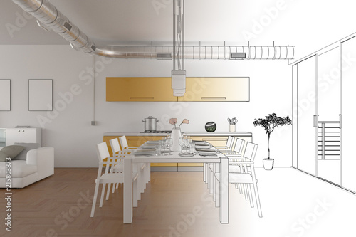 Interior Design Kitchen Drawing Gradation Into Photograph 3d